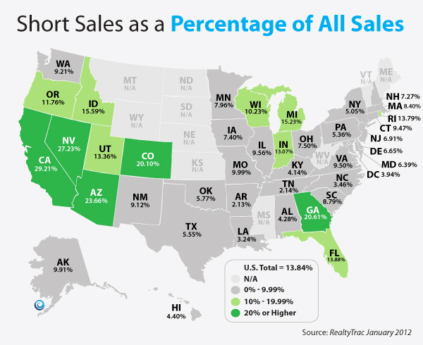 The sunbelt is still leading the National in % of sales that are short sales. This can equate to the regions that were hardest hit in the deduction of home values or loss of equity. The Southeast (particularly Georgia and Florida) were also hard hit with this loss of home values.